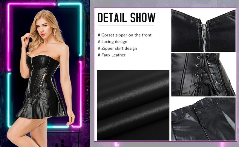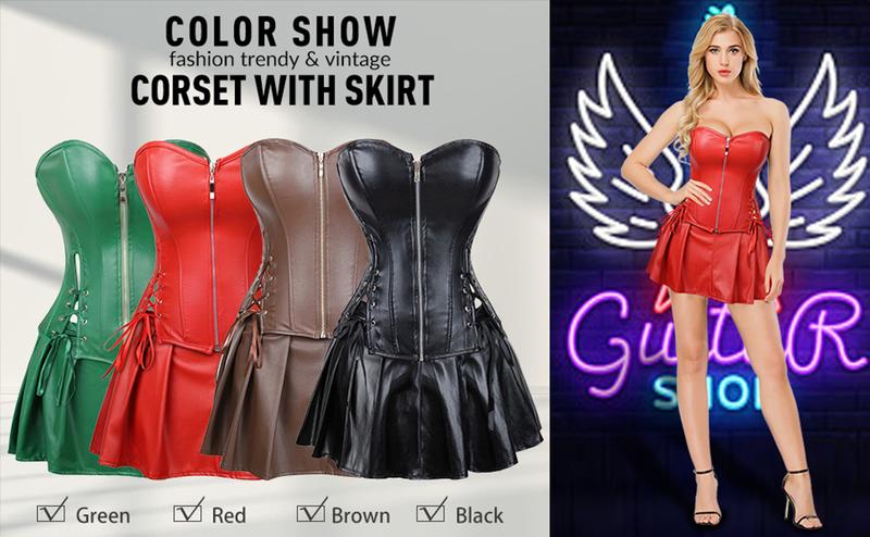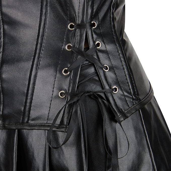 Women's Steampunk Corset Dress Punk Rock Faux Leather Corset with Skirt Retro Goth Waist Cincher